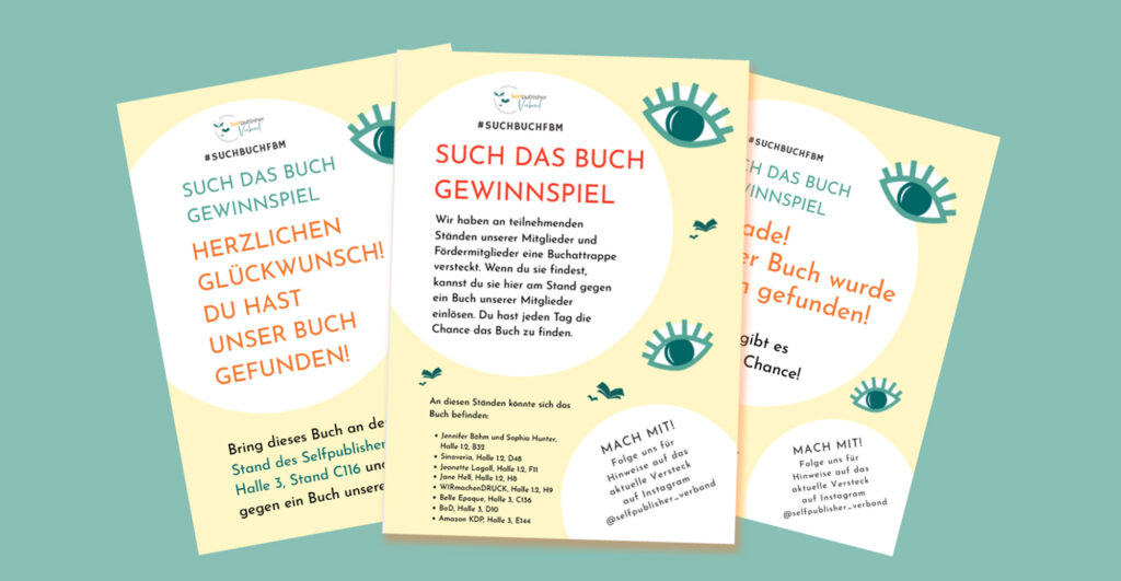 Wir werden an den fünf Messetagen an teilnehmenden Ständen unserer Mitglieder, Fördermitglieder und Sponsoren eine Buchattrappe verstecken. Wenn du sie findest, dann bring sie an den Stand des Selfpublisher-Verbands C116 in Halle 3 und tausche sie gegen ein echtes Buch unserer Mitglieder.