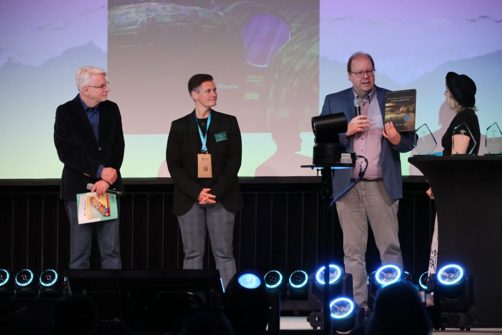 v.l.n.r.: Johannes Zum Winkel (Jury Sachbuch und Ratgeber), Larissa Böhning, Gewinner der Kategorie Sachbuch und Ratgeber: Marc A. Hoffmann, Lea Kaib