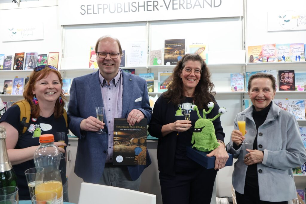 Nach der feierlichen Verleihung der Selbies wurde am Selfpublisher-Messestand bei einem kurzen Sektempfang gemeinsam mit den Gewinner:innen auf den Erfolg angestoßen.